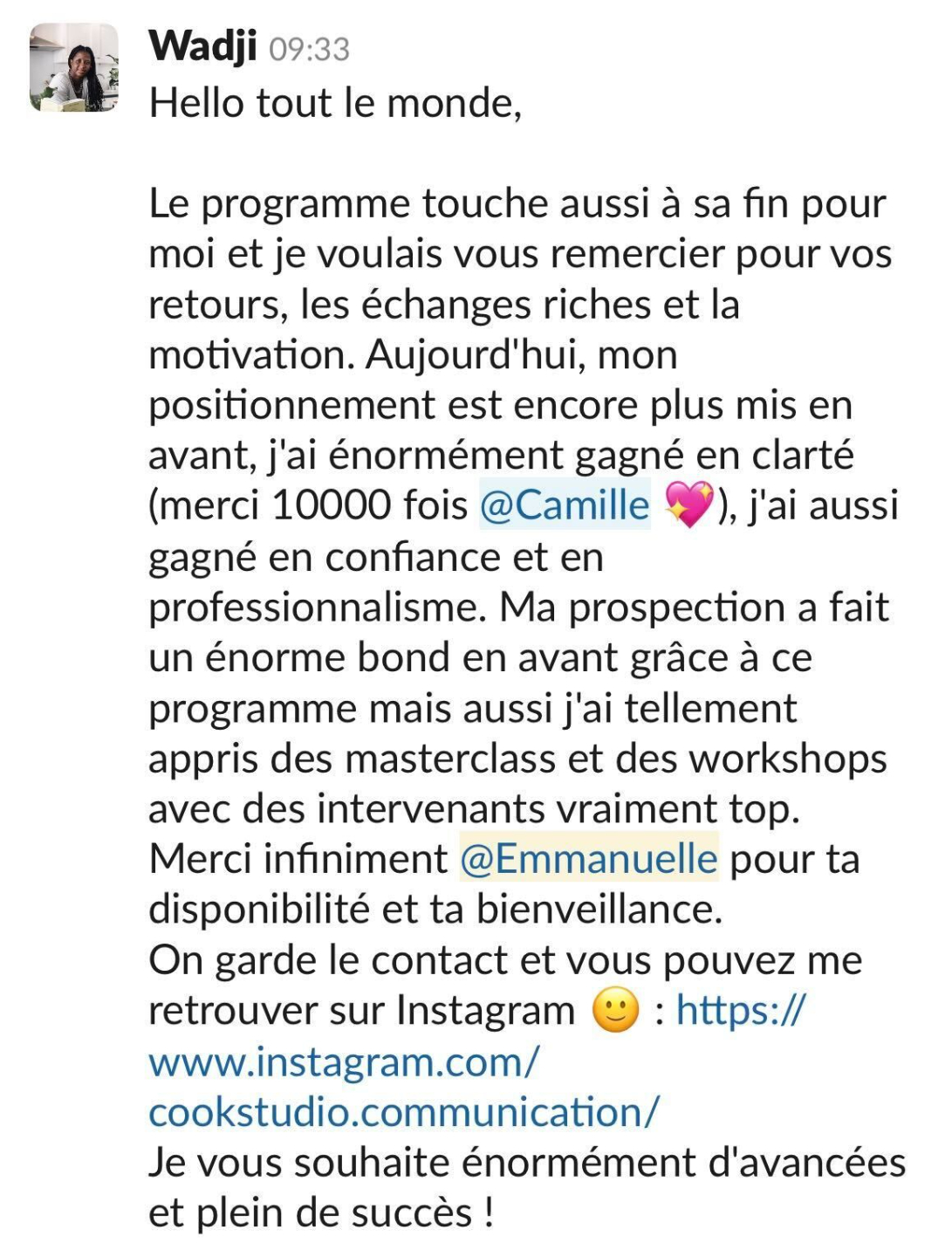"Je suis le programme Social Média d’Emmanuelle et j’adore ! Je vois de vrais résultats sur mon activité et je peux le suivre à mon rythme sans me presser. Vraiment je recommande ✨"